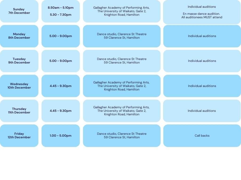 We rehearse Monday to Thursday evenings and Sundays - prior to production week. A draft rehearsal schedule is available by emailing hosmatilda@gmail.com