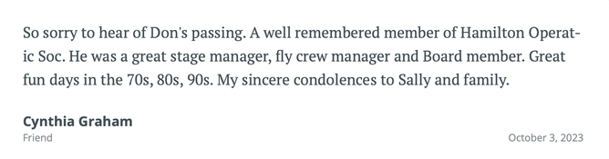 Don was involved with Hamilton Operatic Society Inc. from 1961 to 1989 and is remembered below by friend of the society Cynthia Graham.